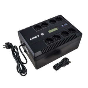 ARIET VT1500 отличается низким уровнем шума (менее 40 дБ), что делает его подходящим для использования в офисах, торговых точках и домашних условиях. LED-дисплей отображает ключевую информацию о состоянии ИБП, уровне нагрузки и заряде батареи, упрощая контроль работы устройства. Поддерживается автоматический запуск после восстановления электропитания и функция зарядки аккумуляторов даже при выключенном ИБП.