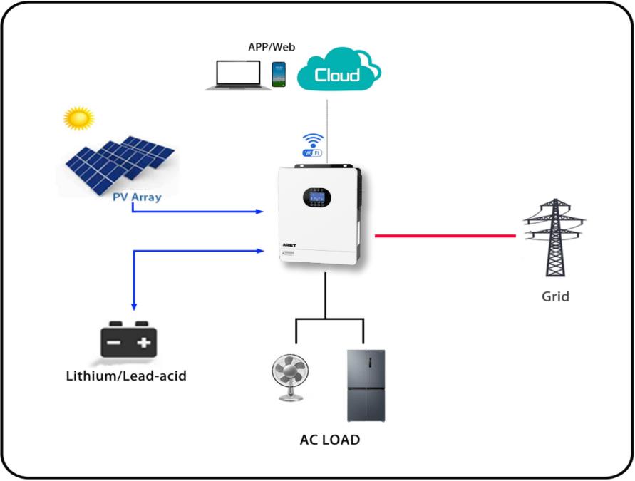 Инвертор оснащён высокоэффективной системой MPPT (до 99,5%), поддерживает работу с аккумуляторами или без них и обеспечивает эффективное управление солнечной энергией.