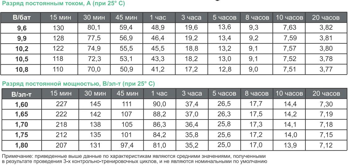 1-часовой разряд (46,4 А; 9,9 В/бат) 46,4 Ач